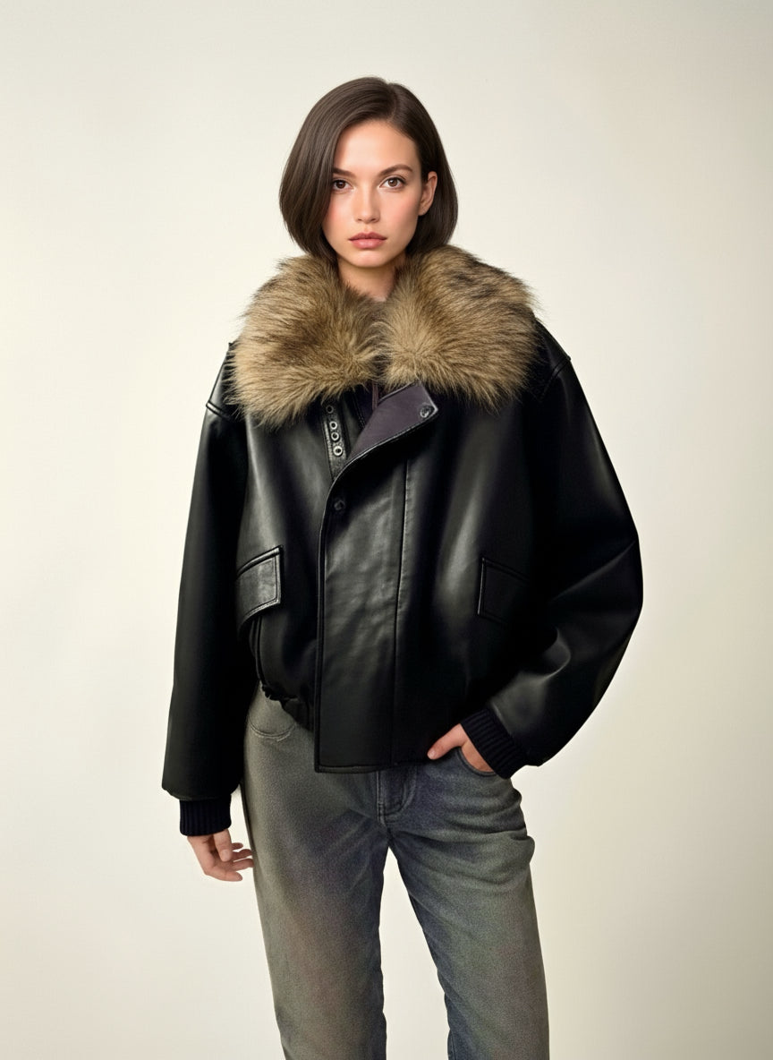 Cyberpunk fur collar leather jacket in BLACK
